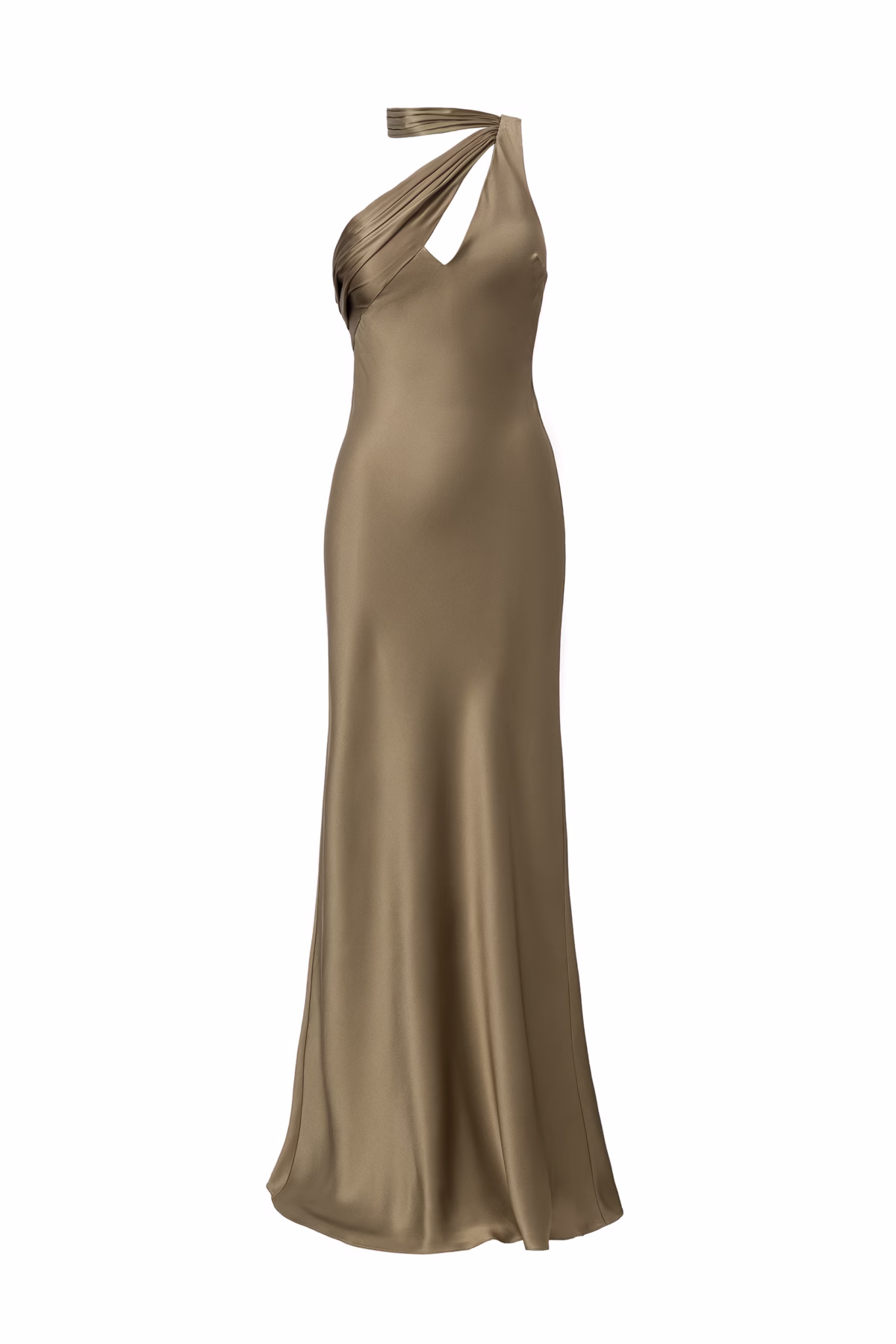 The VIONNE Asymmetrical Silk Dress is a study in sculptural elegance and modern allure. Crafted from fluid silk satin in a rich shade of Khaki, it features an asymmetrical neckline with a plunging décolletage, enhanced by a meticulous hand-draped detail.